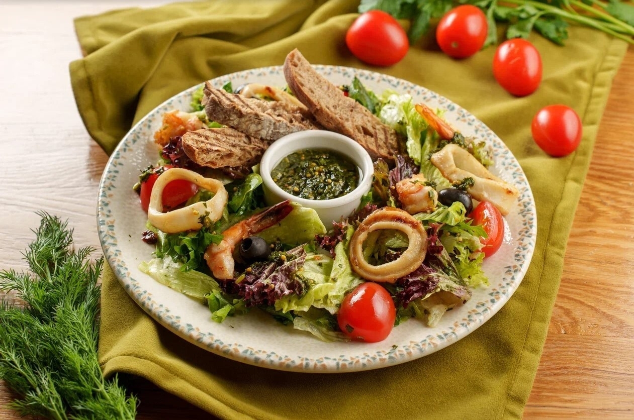 Легкий салат с кальмарами, креветками и фирменным соусом