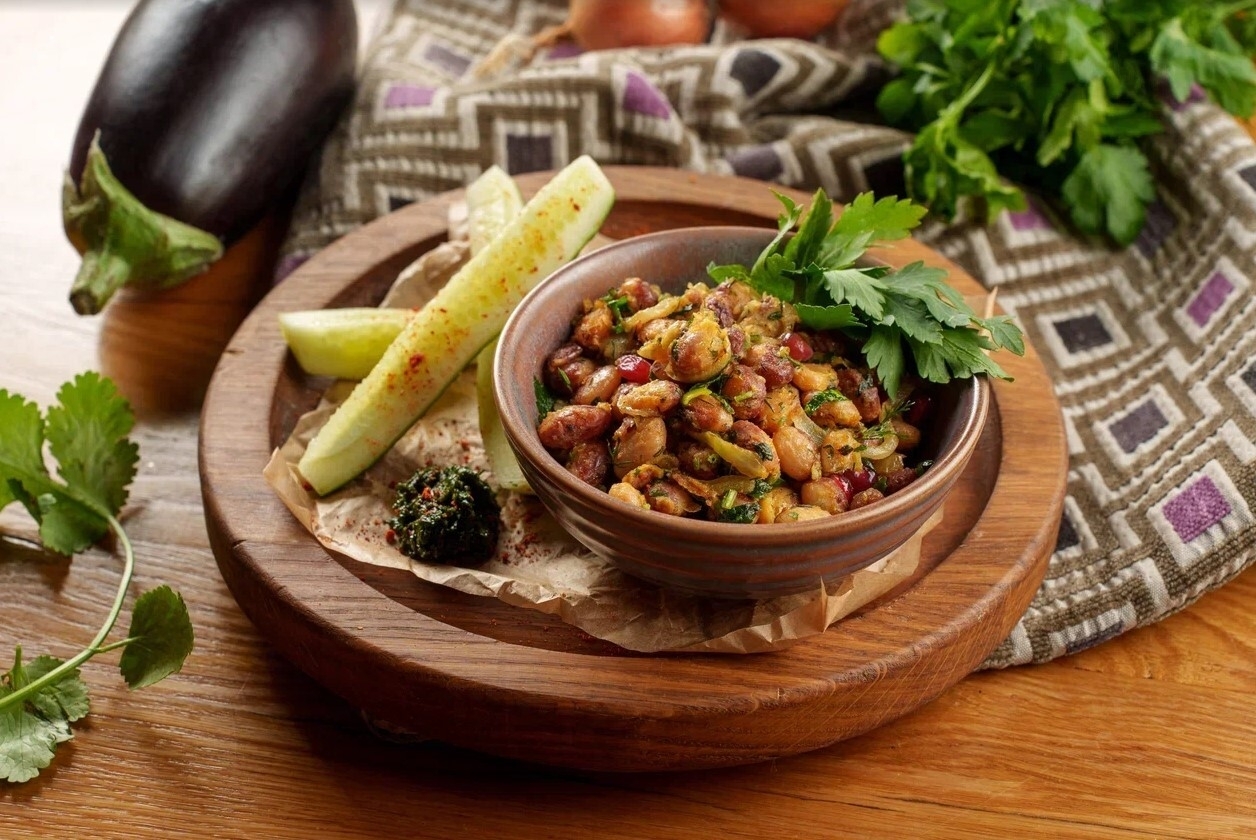 Традиционное грузинское овощное рагу из тушеных баклажанов, томатов и болгарского перца. Подается холодным.