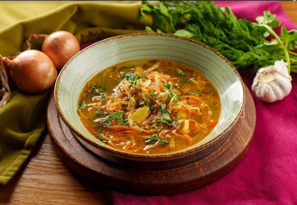 Наваристый суп из мякоти баранины, c бараньими ребрышками на косточке, овощами и зеленью.