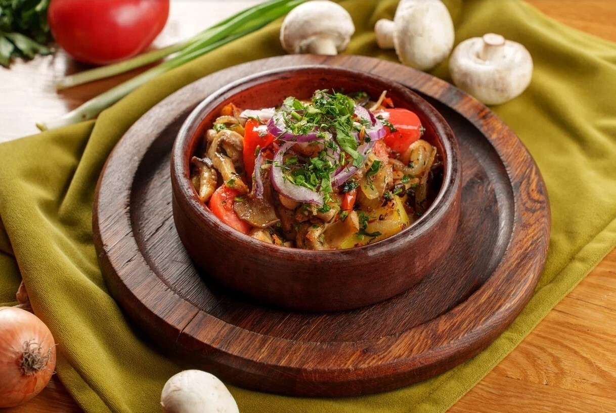 Аппетитные кусочки телятины, тушенные с болгарским перцем, спелыми томатами, луком и грузинскими специями.