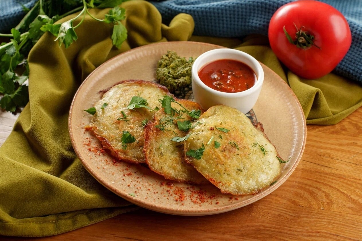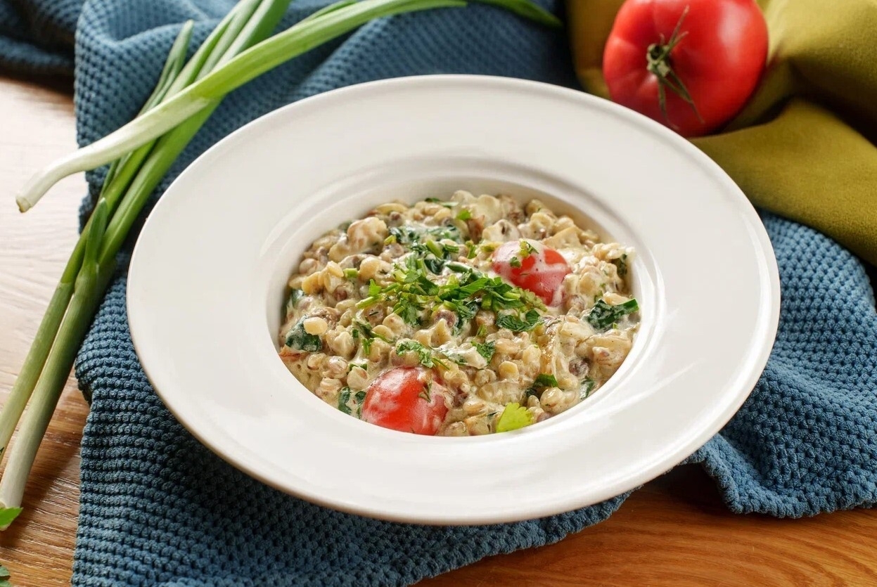 Подается с соленьями, домашним сыром и грузинским хлебом.